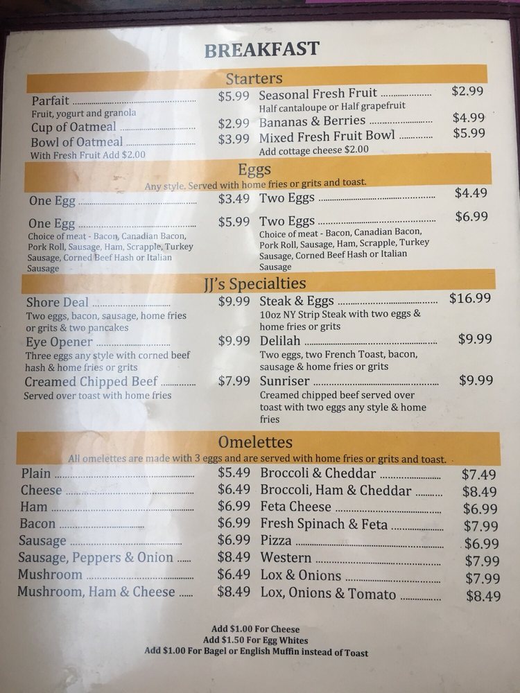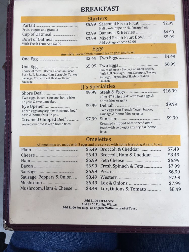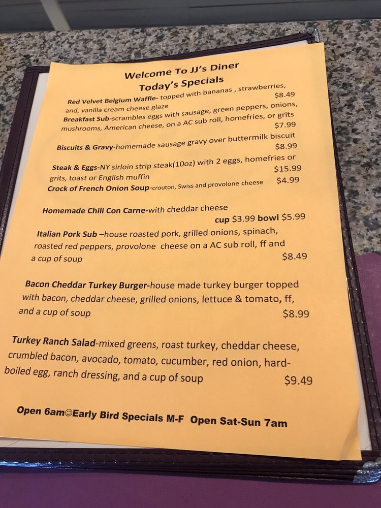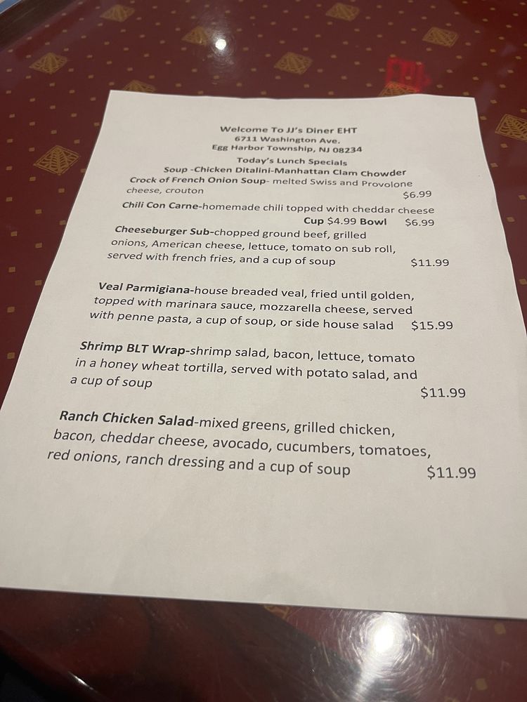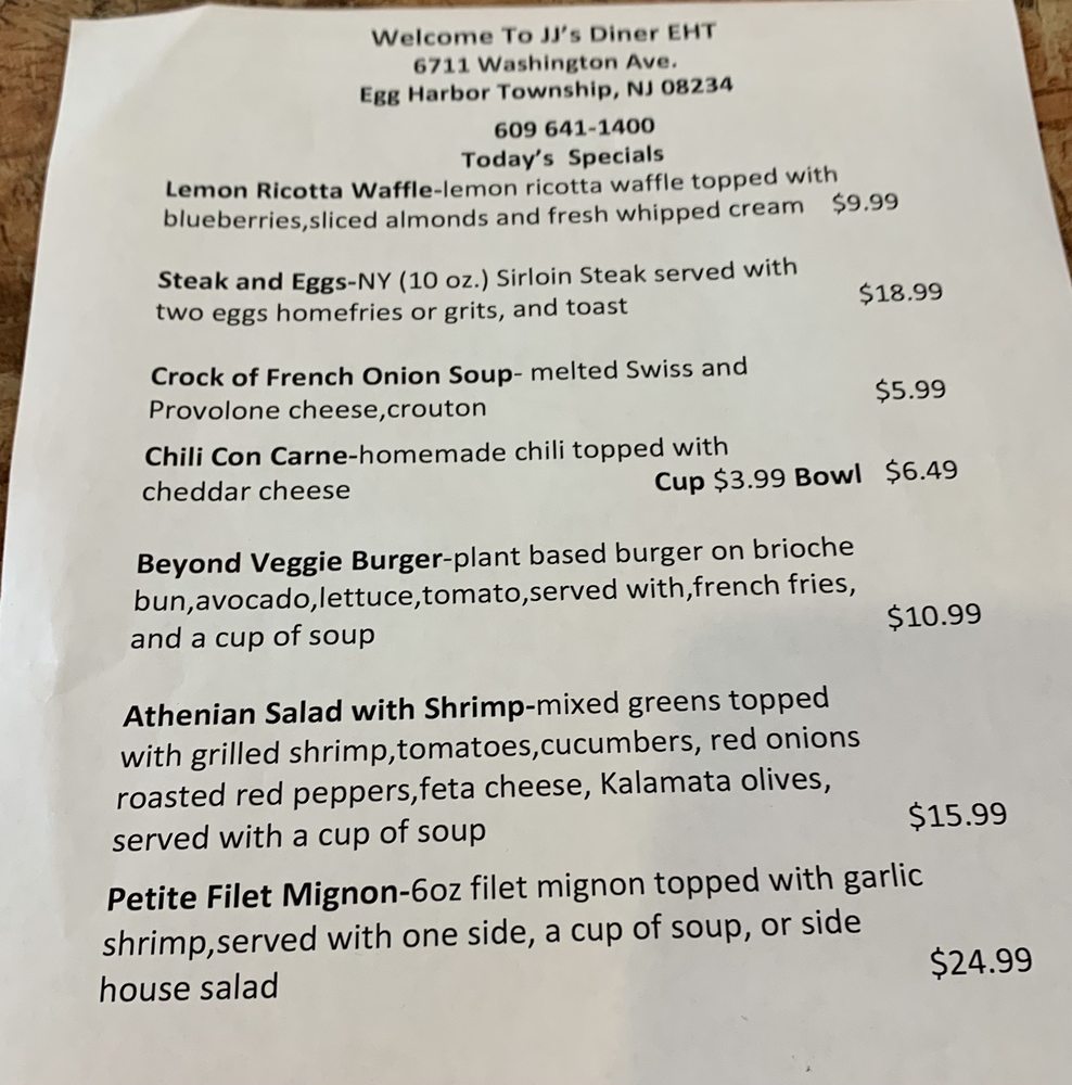 JJ’s Diner in Egg Harbor Township, NJ is a cozy local spot that offers a variety of exceptional dining experiences. With a menu filled with local favorites, the diner provides delicious home-style cooking at great prices. Customers rave about the friendly service and the top-notch food quality. From biscuits and gravy to meat lover's omelettes, the breakfast options are a must-try. The diner's old-fashioned decor adds a nostalgic charm to the dining experience. With a welcoming atmosphere and attentive staff, JJ’s Diner is a go-to spot for a satisfying meal. Don't miss out on their popular dishes like eggs Benedict and flavorful breakfast feasts. If you're in the area, make sure to stop by JJ’s Diner for a delightful dining experience.